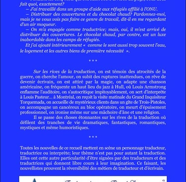 Comme l’indique la quatrième de couverture, « Toutes les nouvelles […] mettent en scène un personnage traducteur, traductrice ou interprète », mais « leur thème n’est pas pour autant la traduction ». Les réactions ou remarques des personnages m’ont toutefois bien rappelé mon métier et la manière dont nous, les traducteurs (humains !), travaillons et réfléchissons.